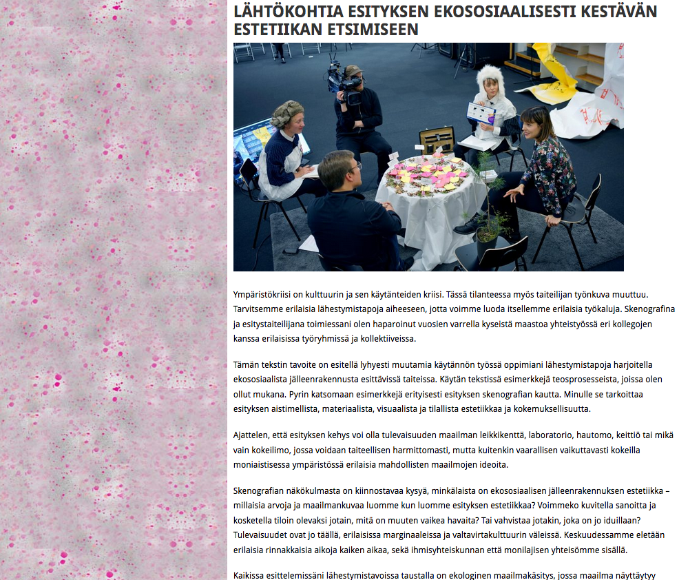 I wrote a short non-academic article to Liikekieli – journal (a journal for dance) about the topic of ecosocially sustainable aesthetics in performance. The article is based on my own examples of working in the field of performance and scenography, and it is aimed to spark inspiration and show some routes to follow for the reader's own exploration in developing their practice. The article is written in Finnish.
